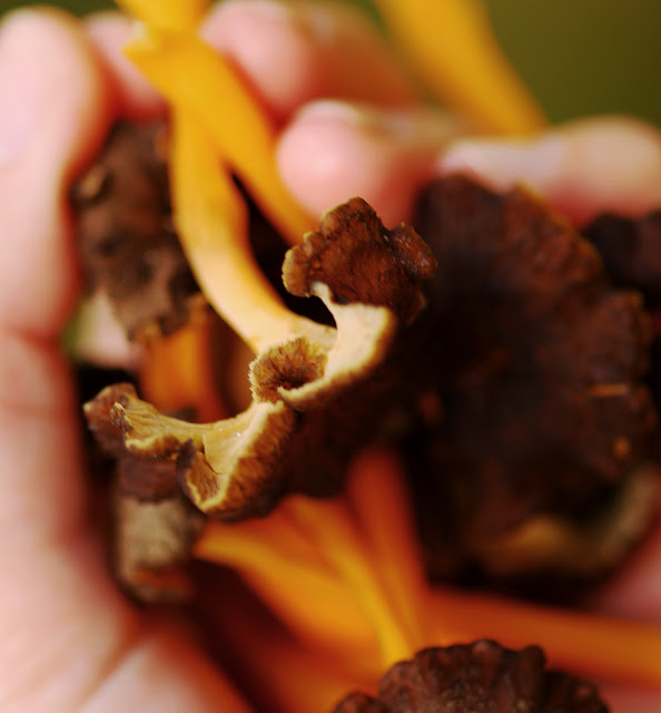 Kantareller har plockats, och de skiljer faktiskt ganska mycket i fjällkantareller och vanliga, både smak, lukt och konsistens, men de är otroligt goda ändå.